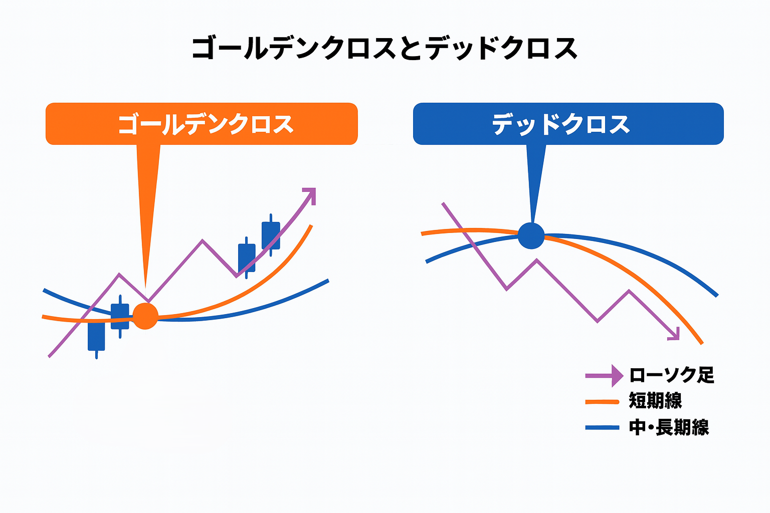 また、短期線が長期線を上抜ける「ゴールデンクロス」は買いサイン、下抜ける「デッドクロス」は売りサインと呼ばれます。